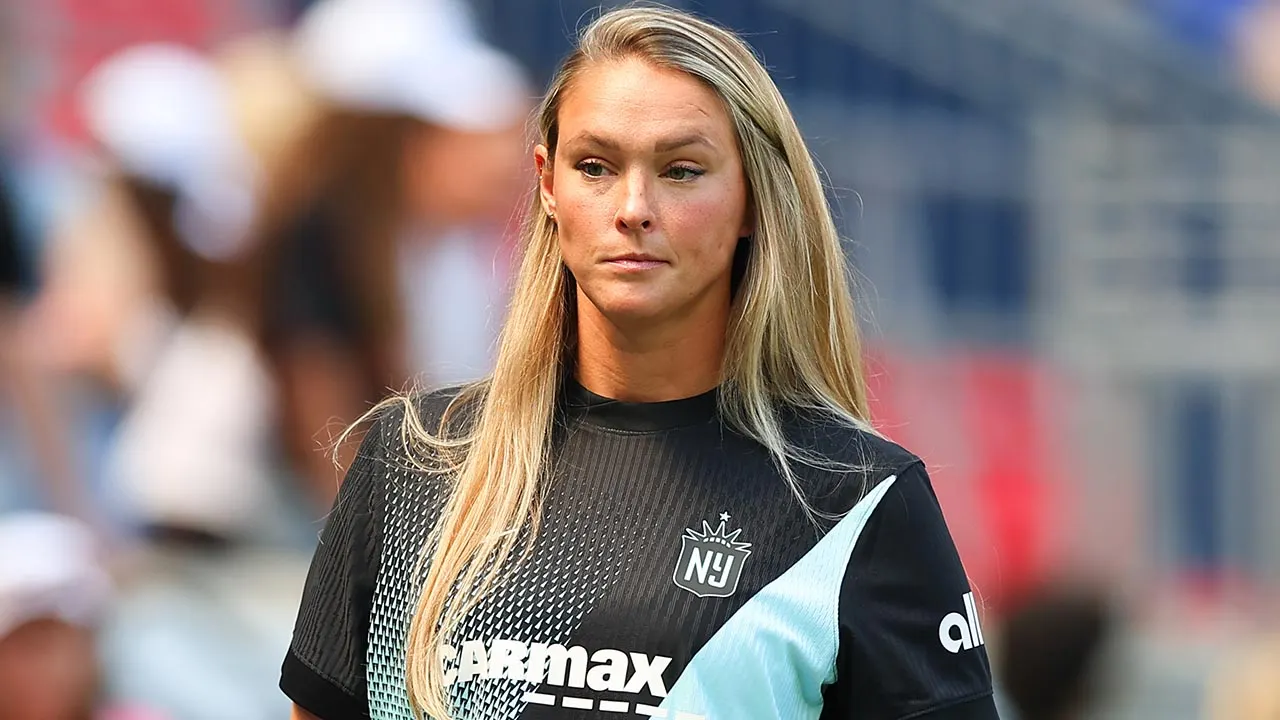 Kylie Kelce, American podcaster and Dove spokesperson, talks to the crowd prior to the NWSL game on Aug. 9, 2025, at Sports Illustrated Stadium in Harrison, New Jersey. (Rich Graessle/Icon Sportswire via Getty Images)